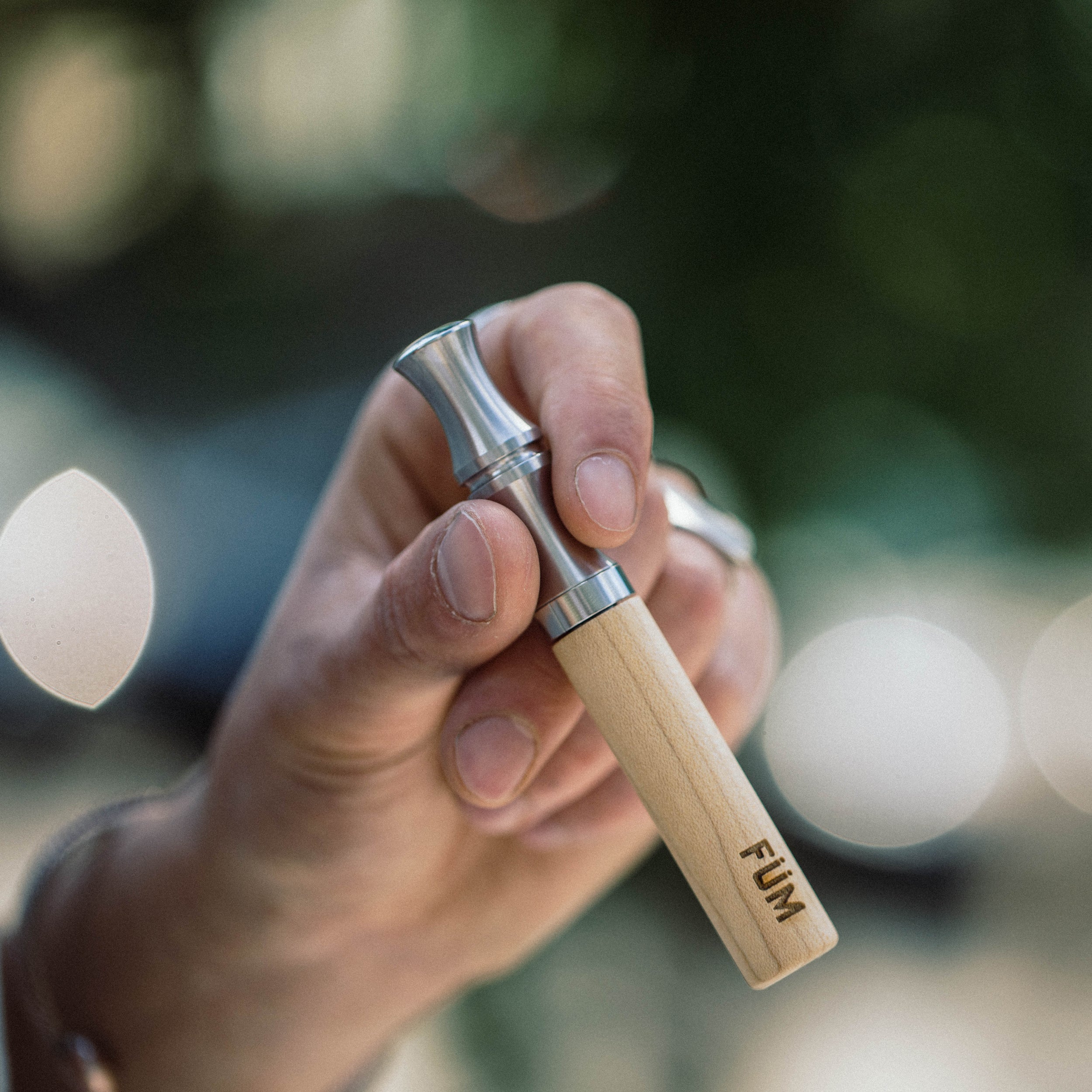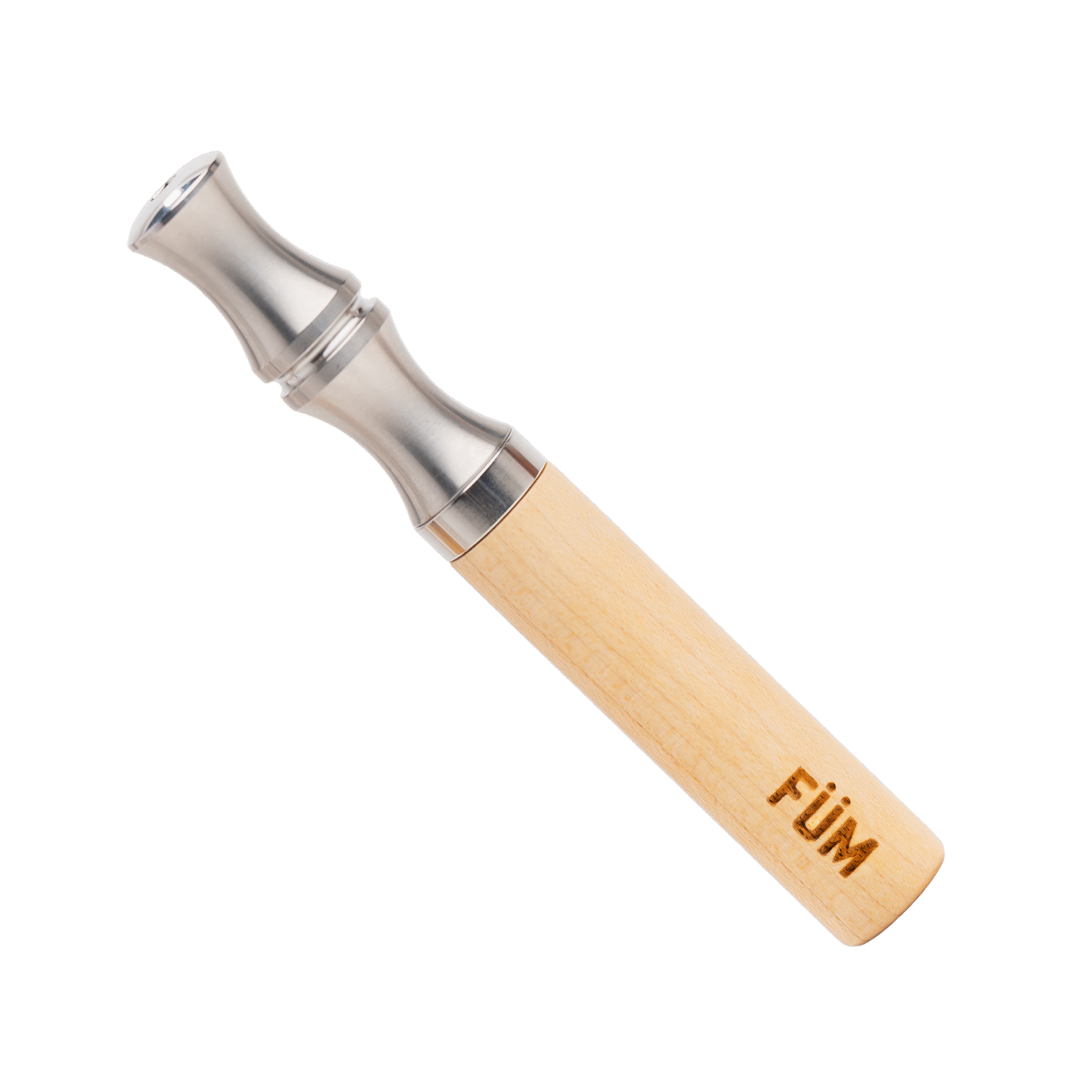 The OG FÜM, featuring a Maple Barrel and Stainless Steel Mouthpiece. FÜM is a flavored air device that combines flavor, fidget, and fixation, specifically designed for habit formation. Each Prominent device comes with a Mini Clean Kit and Habit Tracker.